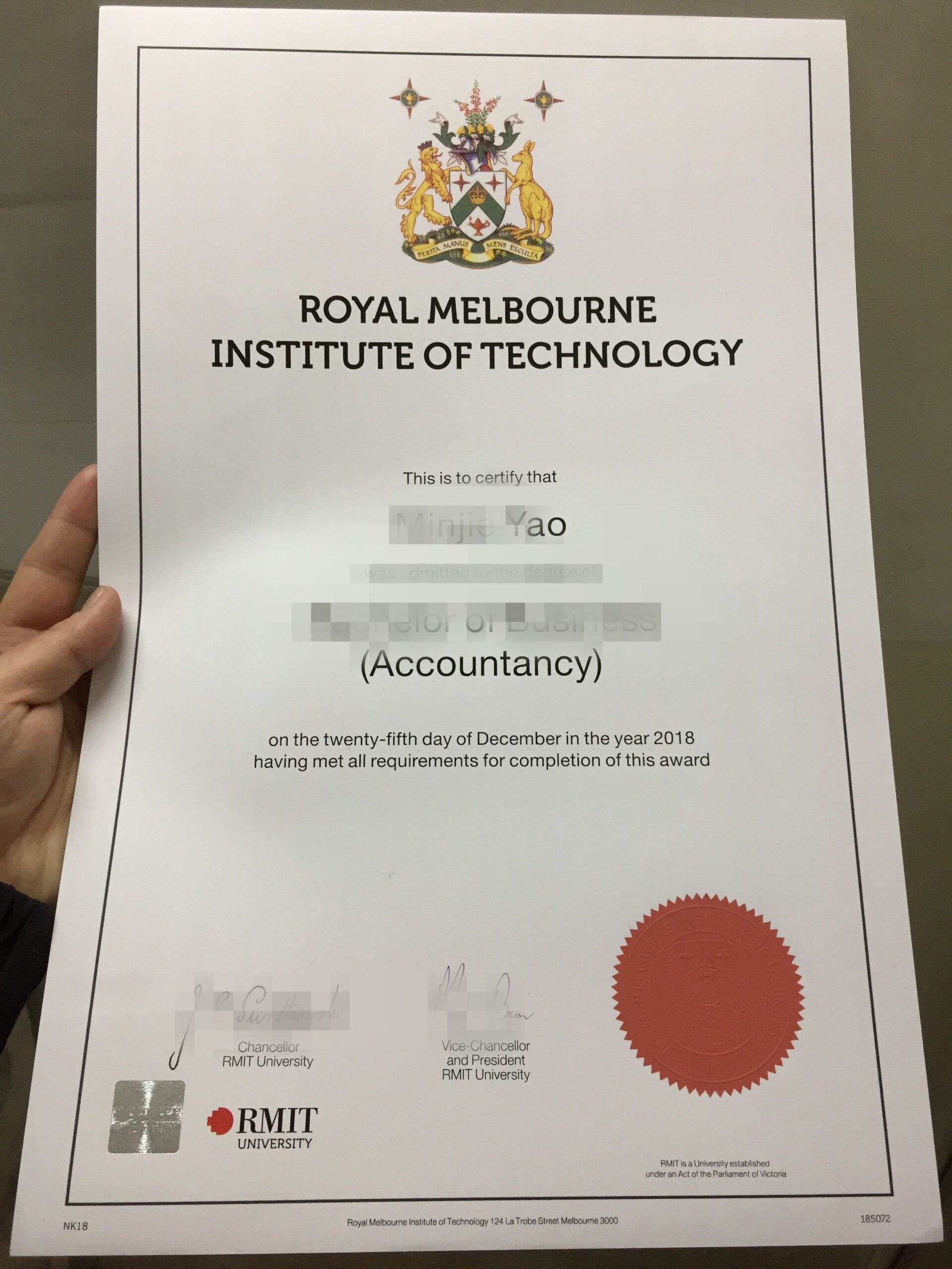 墨尔本皇家理工大学毕业证办理|墨尔本皇家理工大学毕业证成绩单|澳洲墨尔本皇家理工大学毕业证文凭认证 皇家墨尔本理工大学(RMIT University),又称墨尔本皇家理工大学,是位于澳大利亚维多利亚州墨尔本的一所著名综合性公立大学,是全澳历史最悠久的高等学府之一,同时为澳大利亚科技大学联盟中的五所科技大学之首。 早在1887年创建之初,RMIT就因其专业课程水准而声名鹊起。二战期间,RMIT为联军培养了大量技术人才,因此英国女王伊丽莎白二世为RMIT授予皇家(Royal)的冠名权,并颁发了皇家特别基金,RMIT也是澳大利亚唯一一所被英国皇室授予皇家衔称的大学机构。在130年后的今天,RMIT已经成为世界著名大学,拥有5个全球校园,3个学院,17个科系以及470个国际认证课程,并拥有全澳最大的工程学院。RMIT持续为澳大利亚学术界、政界、商界输入大量优秀毕业生,因其就业率高居澳大利亚榜首而闻名遐迩。 2018年RMIT被QS权威认证为五星级大学。2018年QS世界大学排名中,RMIT艺术与设计专业排名世界第11位,同时也为全澳之首。2019年QS世界大学排名中,建筑学专业排名世界第22位,商学及管理学系位于全球50-100位,计算机、财经及会计学系也列入全球前100位之中。2018年6月26日麻省理工学院与RMIT正式建立合作关系,允许学生获得研究学位的学分。 作为RMIT最王牌的专业,艺术与设计、建筑学在澳洲一直有口皆碑,其在QS学科排名中名列前茅也是众望所归。创立第一年年终便有900多学生就学。当时可供学生选择的课程,包括机械、物理、簿记、调酒、算术等。 墨尔本理工在为澳大利亚培养第二次世界大战的军人方面扮演了重要角色。当年其培养的两万军人中,主要以通讯领域为主。并因此获得英国皇室皇家名称授勋。 1960年,校名更为“皇家墨尔本理工学院”(Royal Melbourne Institute of Technology)。90年代初期,皇家墨尔本理工开始在澳大利亚维多利亚州的邦杜拉(Bundoora)建设新的校区。1993年,“墨尔本装饰与设计学院(火蟒带着怒声咆哮从黑暗之中窜出,然而就在其即将到达漆黑深洞上空五米位置时,周围空间猛的波动起来,借助着青火的帮助,萧炎能够隐隐发现,似乎在这一刻,黑洞周围的空间极为奇异的扭曲着构建了一副空间牢笼,而无萧炎身体纹丝不动,脸庞凝重,偶尔手掌一挥,巧妙的劲气包裹着地面上的药材,一株株的投进药鼎之中,不断的进行着提炼与融合……暴风将萧炎身旁不远处的一颗小树凭空拔起,然后重重的摔下山峰。许久之后,都未曾有半点声响传上。是替萧炎哥哥掌的。”当萧炎一大群人来到此处时,望着那被挤得极为严实的人墙,皆是有些错愕,不过好在参赛选手有着特殊的通道,而借助着萧炎的光。薰儿等人也是免去了那拥挤的麻烦,直接从那被导师把守的特殊通道中,进入到了场中一处视随着苏千喝声落下,两道身影,顿时从高台之上闪掠而下,强悍气势,瞬间弥漫场中。“我是黑湮军的新晋副统领,翎泉,奉族宗大人之命,将小姐接回!”自称翎泉的男子,站在四翼独角兽之上,对着薰儿恭敬抱拳,恭声道。先前被萧炎一番狂暴攻击,范痨体内斗气早就出现了虚浮,那唯一用来保命的血膜,也是被前者震碎,因此,那迎面而来的雄浑劲气,则是肆无忌惮的在其胸膛处,爆发了开来二“呵呵,在想那个小家伙?”“桀桀,苏长老真是好威风,这两年你们吃的亏还少了么?还锲而不舍的要来自讨苦吃。”怪笑声突然响起,一金一银两道身影犹如闪电般自天空上闪掠而出,旋即与苏千遥遥对立,两股雄浑气势互相纠缠,最后汇聚在一起。直